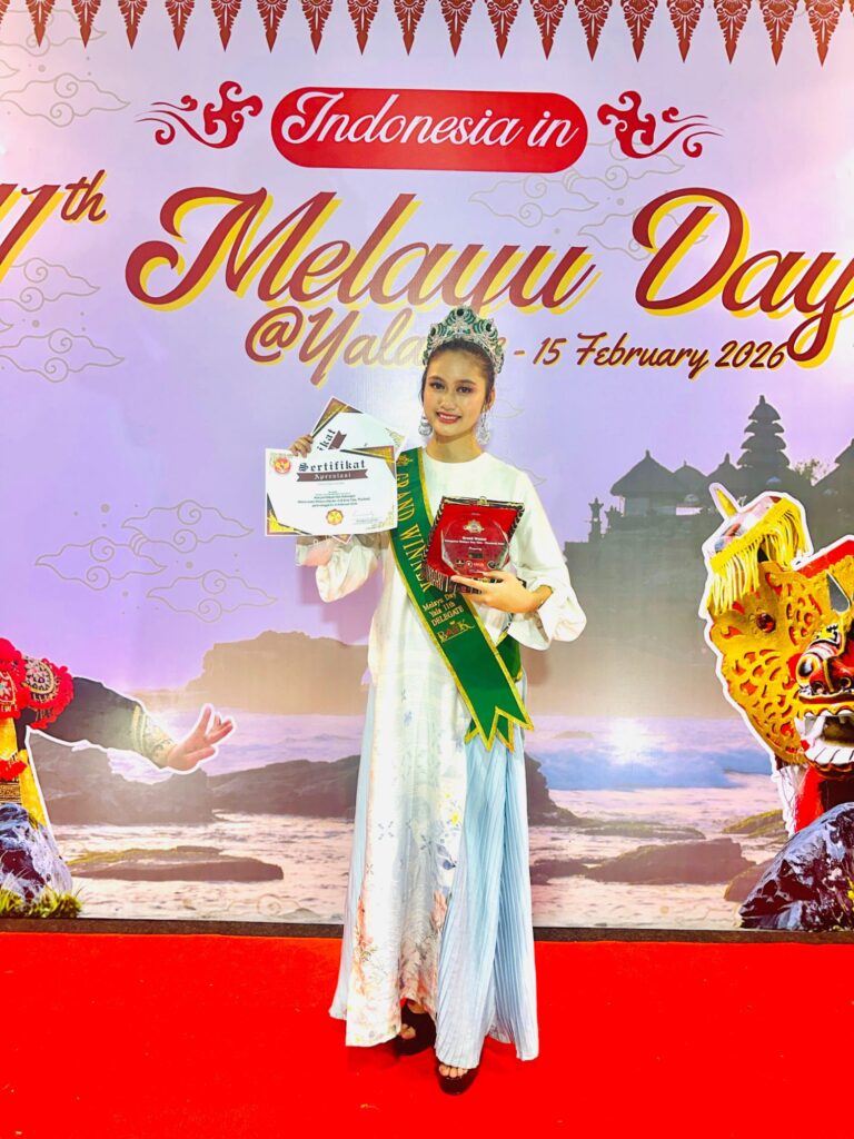YALA, TeropongJakarta.com – Generasi muda Indonesia kembali mencatatkan prestasi di panggung budaya internasional. Puteri Kebaya Indonesia Remaja 2025 sekaligus Ketua Komunitas BAIK (Berbudaya Anak Indonesia dengan Kebaya), Anindya Mutiara Cinta, meraih gelar Grand Winner dalam ajang Melayu Day Yala 2026 di Thailand Selatan. Ia juga dinobatkan sebagai Best Traditional Presentation dan People’s Choice Delegate.